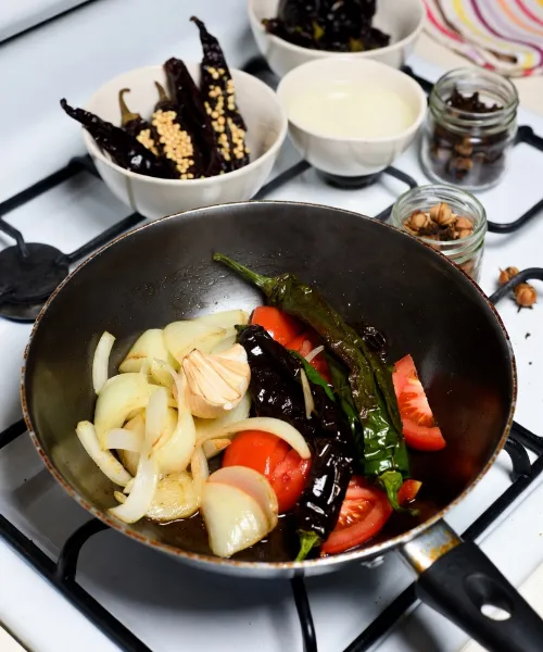 Agrega los chiles hidratados, un jitomate picado en cubitos, cuatro pimientas y un par de clavos de olor.