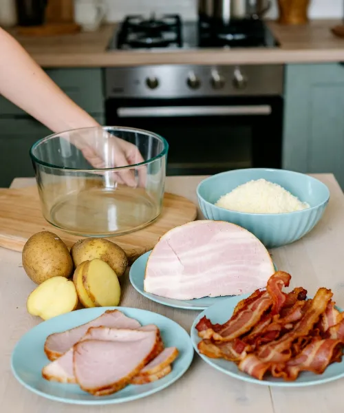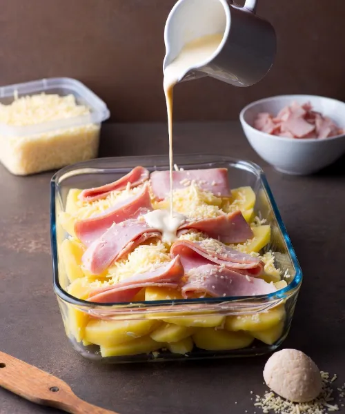 En esta receta aprenderás a preparar una versión casera muy cremosa, usando papas pre cocidas, una mezcla láctea licuada y capas de jamón y queso que le dan un sabor profundo y casero.